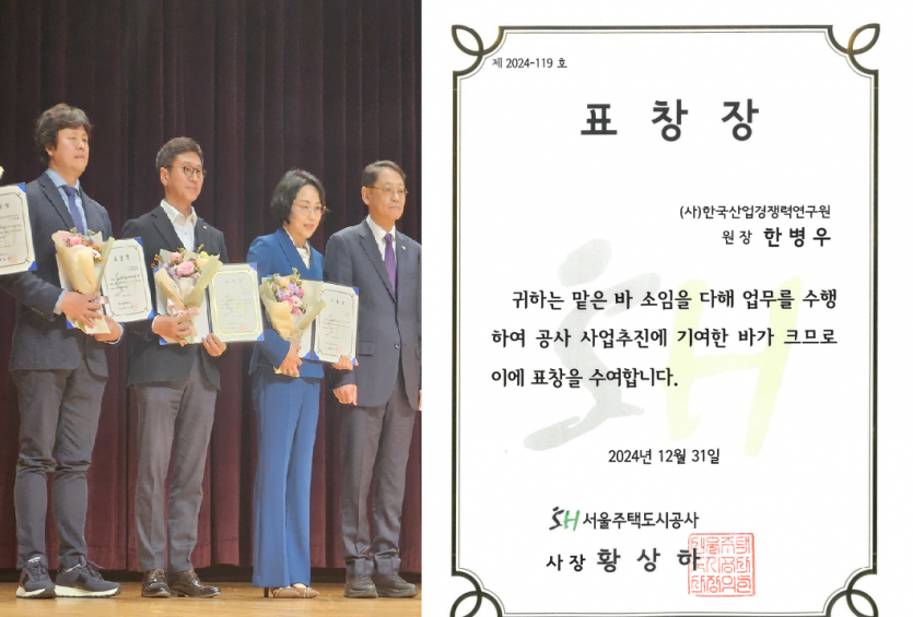 한국산업경쟁력연구원은 공사 사업 추진에 기여한 공로를 인정받아 SH로부터 표창장을 수여받았습니다. 이번 표창은 연구원의 지속적인 노력과 성과를 대외적으로 인정받은 뜻깊은 자리였습니다.